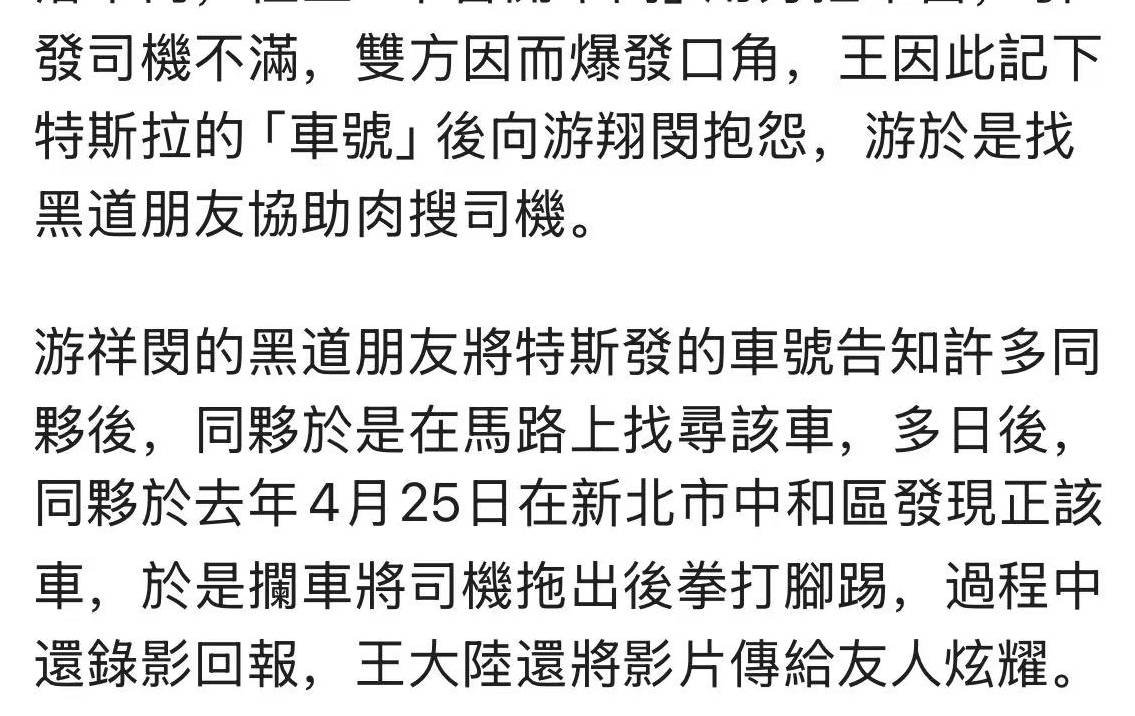 报道指,王大陆承认找游翔闵教训司机,但他不知道对方会伤人。