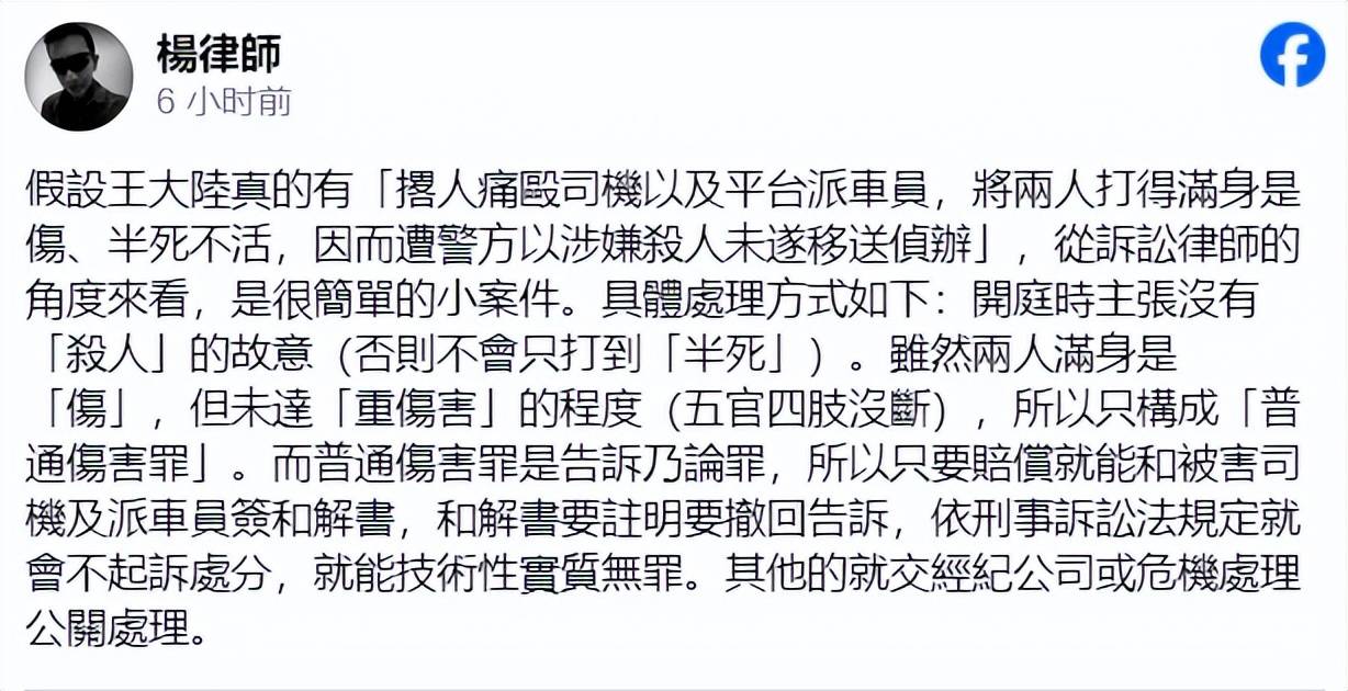 另一位网红律师吕秋远则发文指出,如果是普通伤害罪,会主动被检警以“杀人未遂”的罪名侦办,甚至声请羁押,一定不是这么简单的“把人打得很惨”。