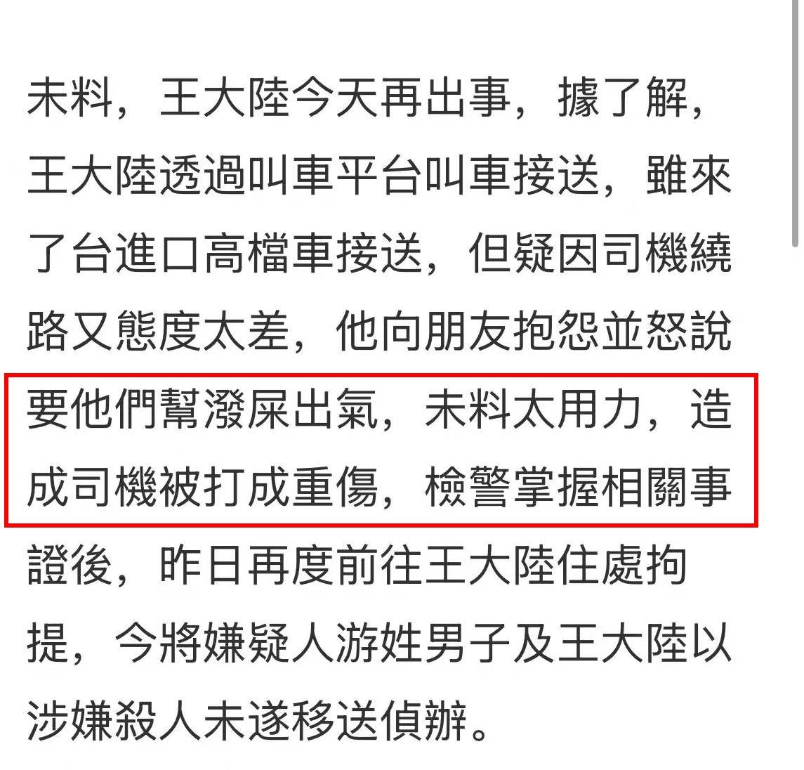 有媒体指出,其实网约车司机受伤并不严重,不过游祥闵为了邀功,特意说司机被打得很惨,让王大陆信以为真。