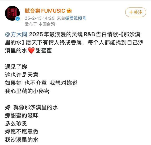 3月1日,方大同创立的音乐厂牌“赋音乐”发布讣告:以积极的态度面对顽疾5年,方大同于2025年2月21日早晨,平静而安详地离开了这个世界。大象新闻发现,2月13日,方大同所属公司还在推介他的新歌《那沙漠里的水》。
