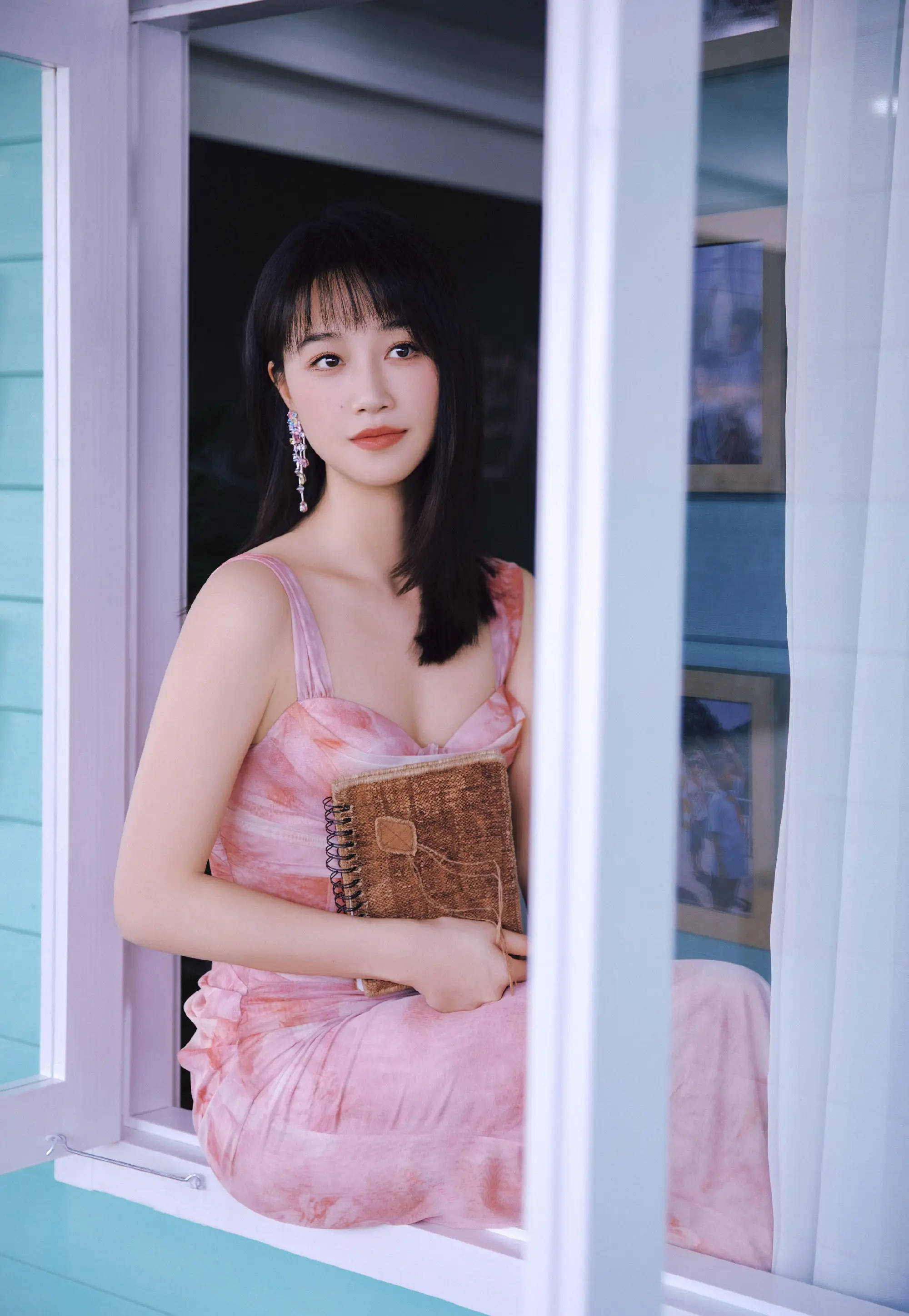 蓝盈莹侧颜精致,一袭粉色吊带裙甜美温柔。