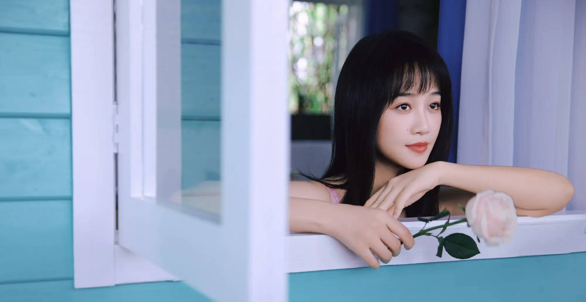 蓝盈莹望向窗外,眼神灵动。