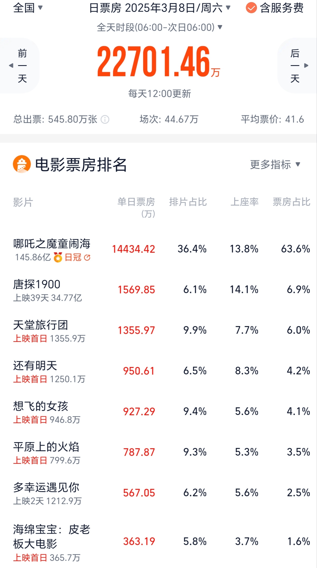 搜狐娱乐讯 (哈麦/文)今年三八档,有《天堂旅行团》《还有明天》《想飞的女孩》《平原上的火焰》《海绵宝宝:皮老板大电影》《多幸运遇见你》《编号17》《插翅难飞》八部新片上映,结果,冠亚军还是春节档上映至今的《哪吒2》和《唐探1900》,《哪吒2》上映第39天单日票房1.44亿元,累计145.86亿元,《唐探1900》上映第39天单日票房1570万元,累计34.77亿元。这两部电影各占当日票房的63.6%、6.9%。