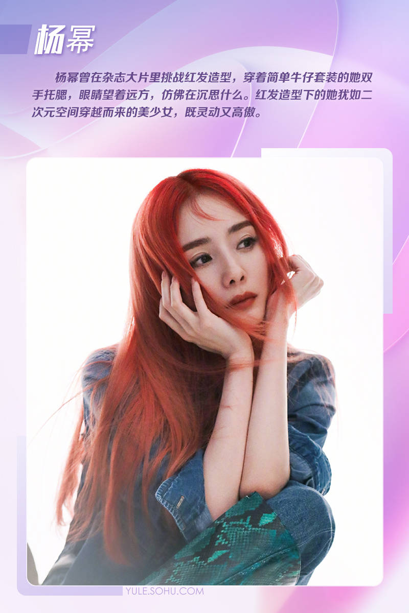 杨幂曾在杂志拍摄中挑战红发造型,穿着简单牛仔套装的她双手托腮,脸颊微侧,注视着远方,仿佛在沉思着什么,红发造型将杨幂原本就“不服输”的一面彰显的更加明显,此刻的她不再柔软,而是锋芒毕露。