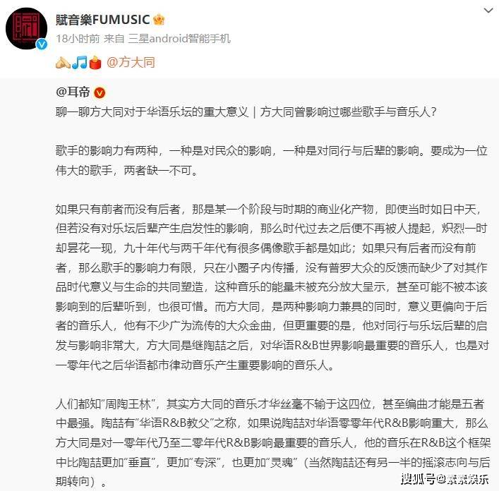 著名音乐人耳帝说评价歌手方大同,他说歌手的影响力有两种,一种是对民众的影响,一种是对同行与后辈的影响。