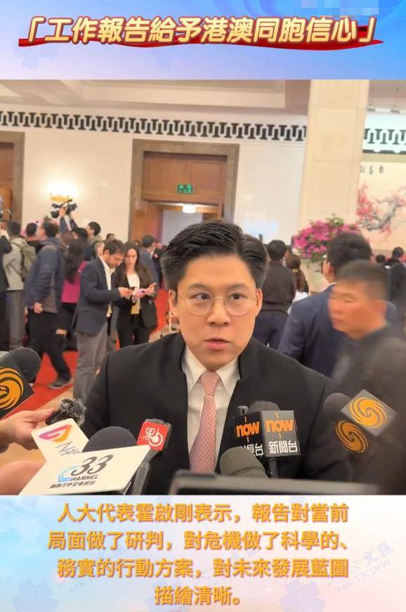 政府工作报告全程一个多小时,霍启刚全部认真聆听,面对记者追问时,他显得异常兴奋,表达了对香港未来发展的信心。