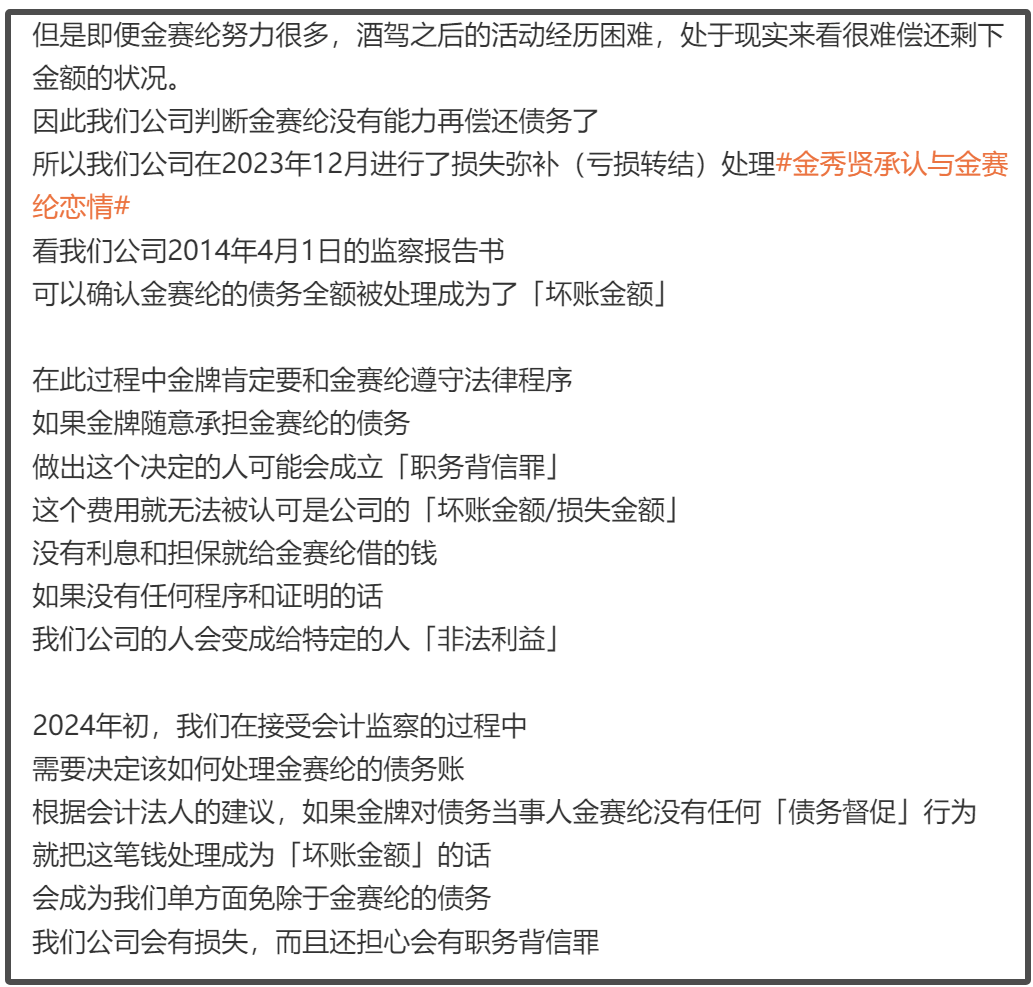 经纪公司还是跟之前的说法一致,总结起来就是没打算让金赛纶真的还钱,只是走个形式,如果不走形式,公司的员工就有法律风险,所以他们只能按照流程走,最终再做坏账处理。