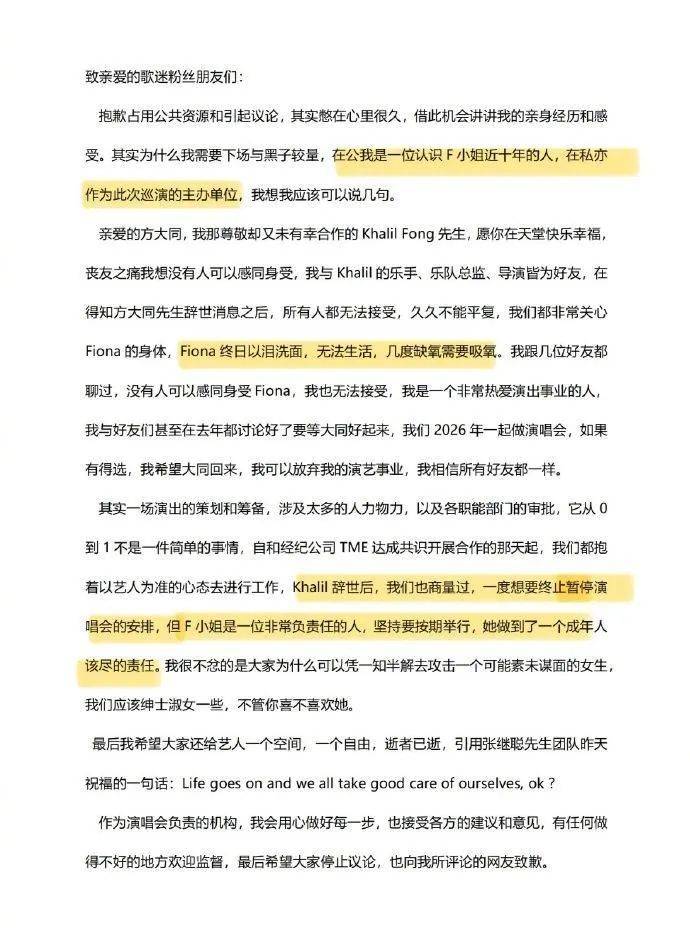 直到有主办方发文替她说话,描述了她最近的情况。在方大同去世后,薛凯琪终日以泪洗面,几度缺氧需要吸氧,但无人能与薛凯琪感同身受。并且表示,薛凯琪是一个非常敬业的人,坚持在自己精神状况不佳的情况下,将之前协定好的演出一一完成。