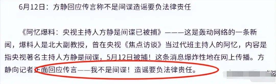 2009年6月的一天,一位北京大学新闻与传播学院副教授、本名周忆军网名阿忆的人,在其名为《考试作弊已实现了现代化》的博文中称:“央视主持方静为窃取军事情报给台湾男友,所以进入《阿务新观察》栏目,她已经在5月12号被批捕。”