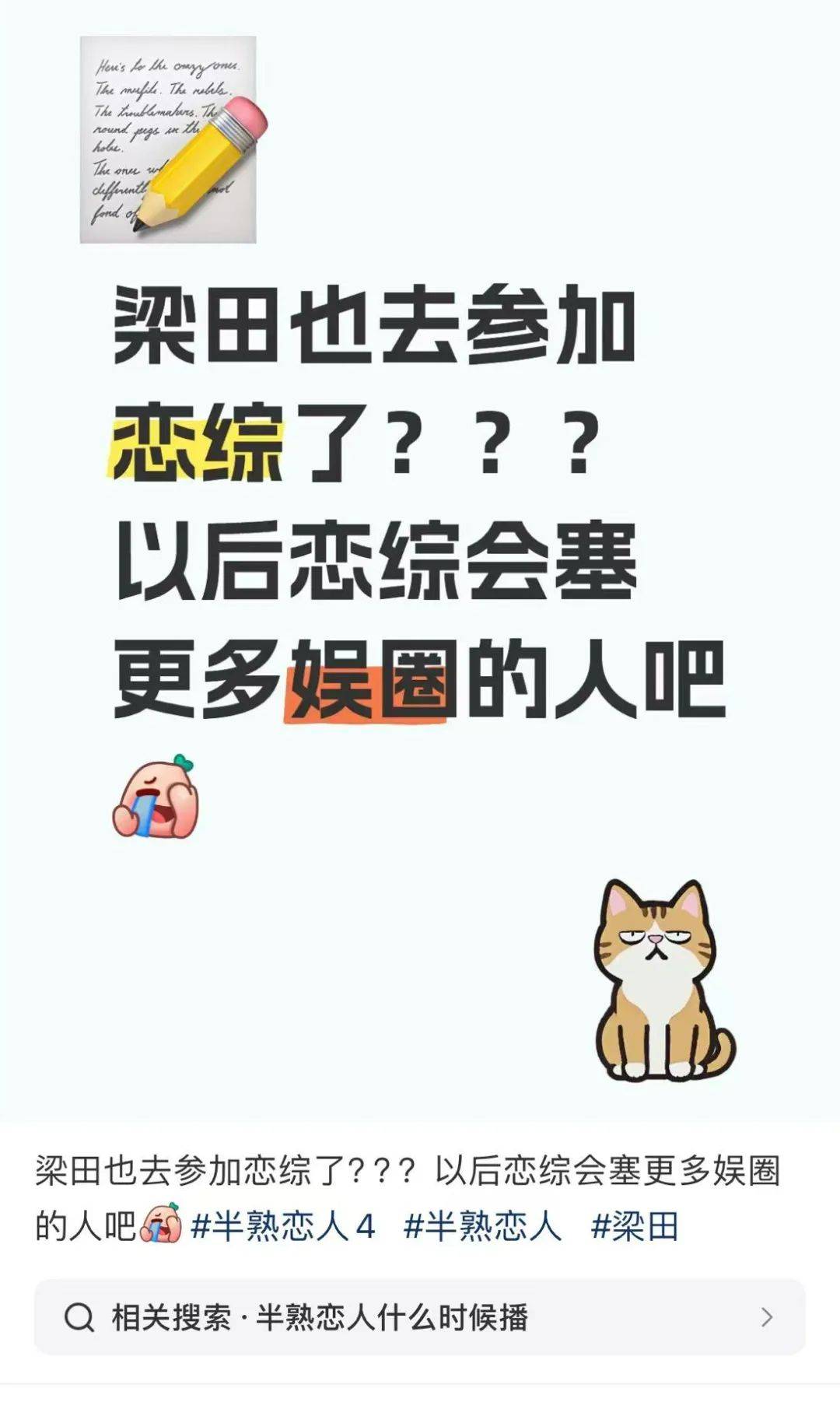 甚至还有人觉得梁田参加恋综会导致以后更多的内娱边缘人被赛到恋综里去。