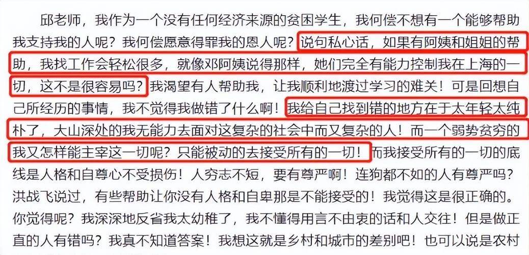 在信里,他历数自己在大学生活中的种种不如意,表示自己在大城市中努力融入的过程非常艰难。