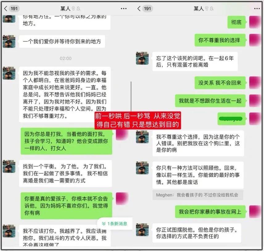 玫瑰发文称两人离婚是因为毛子家暴、辱骂并无休止的PUA她,两人的聊天记录也被曝光,女方提到男方打了她很多次,嘴巴流血、被掐晕、还让女方在高速上解安全带说要撞她……而对于女方所说的种种行为,男方的回应只是说“sorry”,也变相承认了有过这些举动。