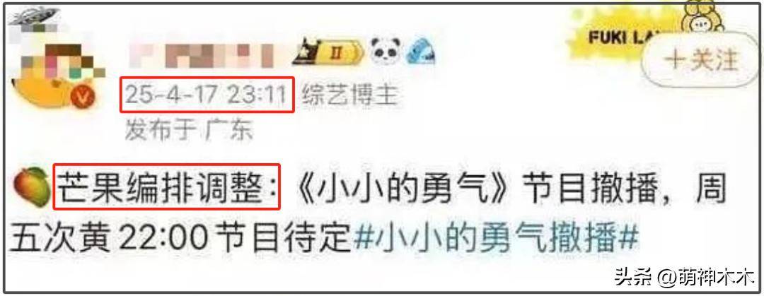 早在节目播出前的一晚,就有大V爆料芒果台要进行节目排班的调整,因此《小小的勇气》将撤停,但却并没有给出具体撤播理由。节目撤播后,又有粉丝公号表明因“播出介质”问题暂停,但随后这条信息又被迅速删除。