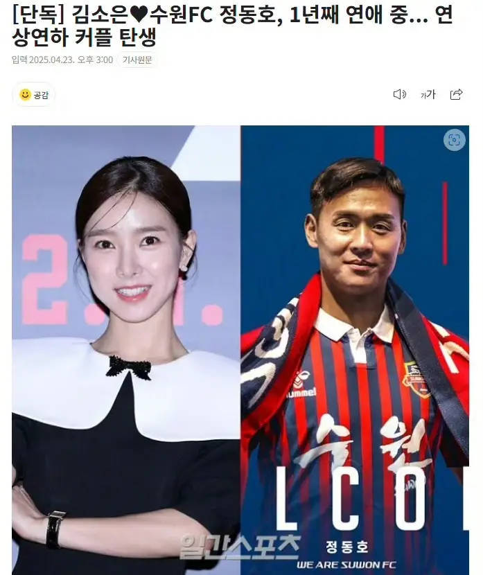 此前,韩媒曝金素恩和职业足球选手郑东浩恋爱中,自去年3月起已交往超一年。报道称,二人在室内高尔夫聚会上相识,郑东浩对金素恩一见钟情并主动追求,目前正以结婚为前提认真交往,常同游日本、马来西亚等地培养感情。