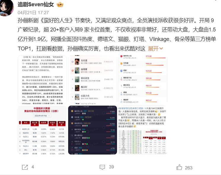 近段时间,孙俪新剧《蛮好的人生》节节开花,无论热度还是收视率都霸榜,还直接带动了大盘。