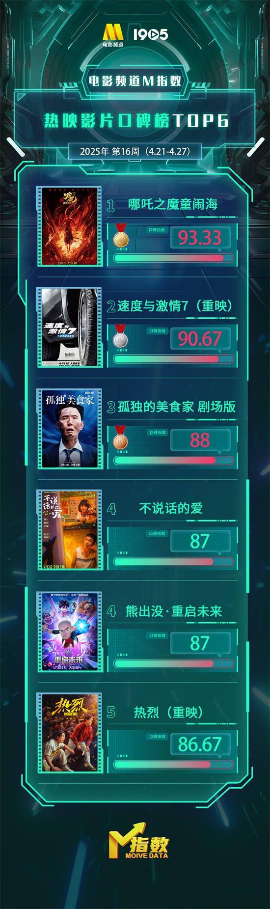 1905电影网讯 “电影频道M指数”2025年第16周结果发布。4月21日-4月27日,“电影频道M指数”热映影片口碑榜前6位依次为:
