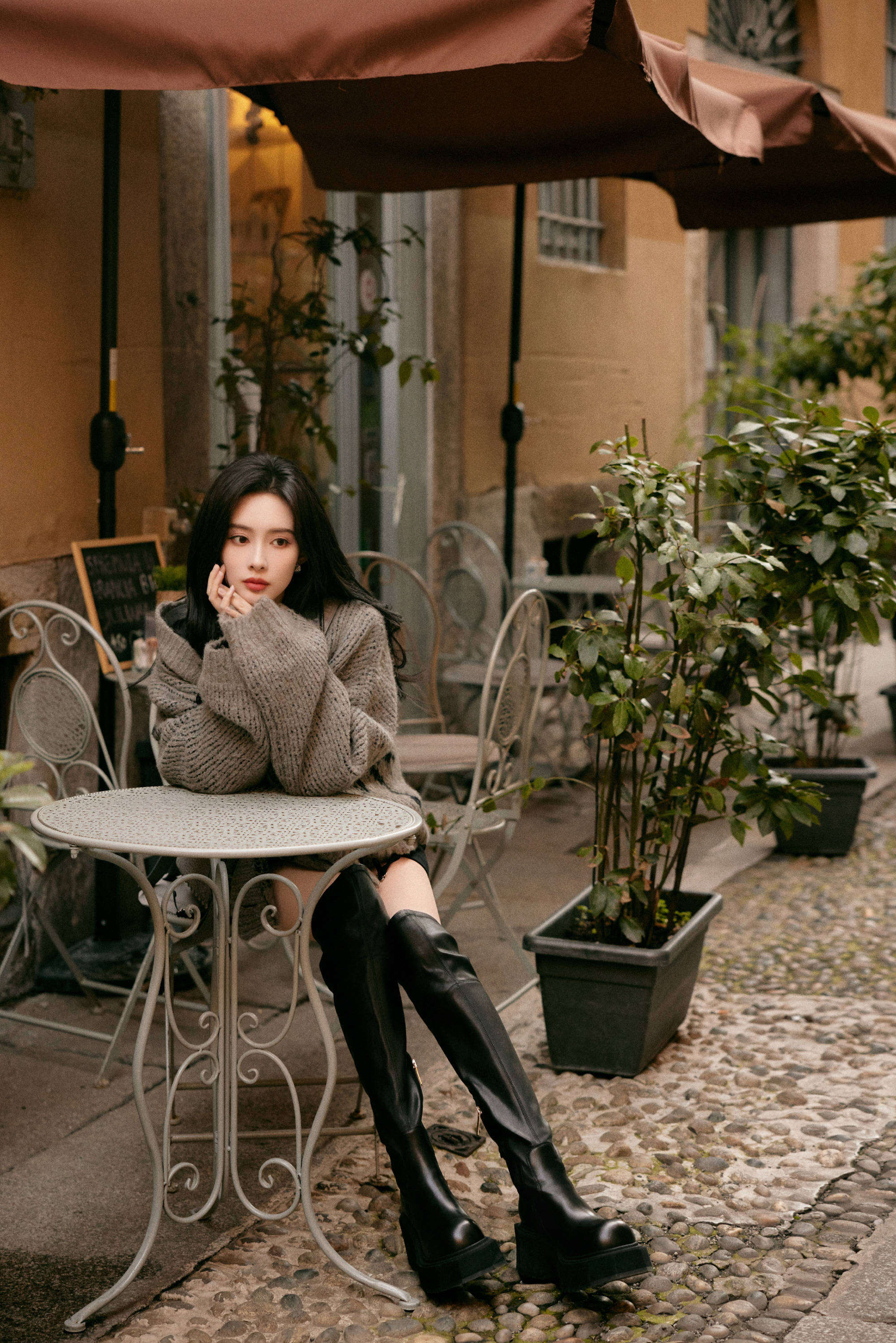 孟子义身穿灰色毛衣搭配黑色长筒靴。