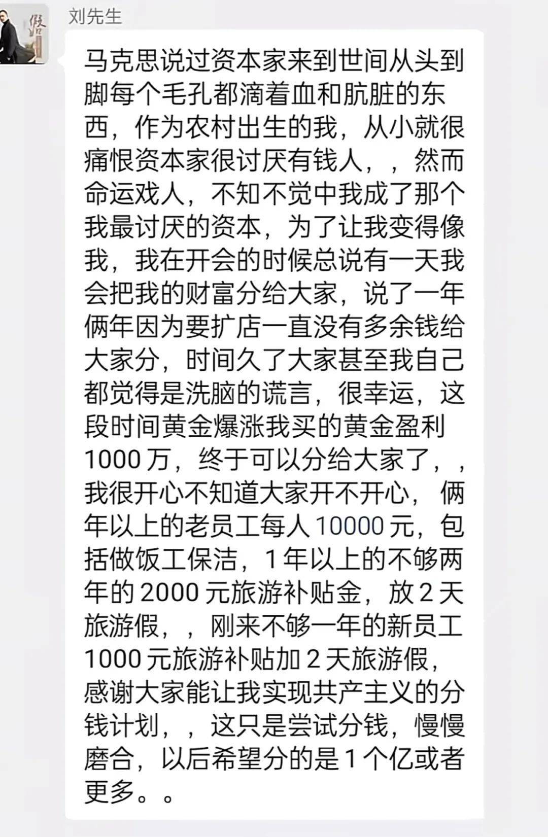 在此次分钱的群聊中,他发了一段长文说到,“马克思说过资本家来到世间,从头到脚每个毛孔都滴着血和肮脏的东西。作为农村出生的我,从小就很痛恨资本家很讨厌有钱人,然而命运戏人,不知不觉中我成了那个我最讨厌的资本。”
