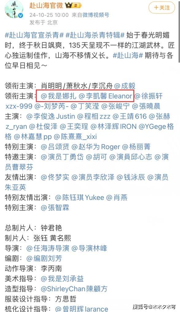 4月9号《赴山海》剧方发布的最新微博,李凯馨的名字已经看不到了,而去年10月份官宣杀青时,李凯馨的名字还排在娜扎的后面,显然是女二号的位置。