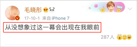 但到了2017年的10月1日,毛晓彤突然发文说:从没想象过这一幕会出现在我眼前。