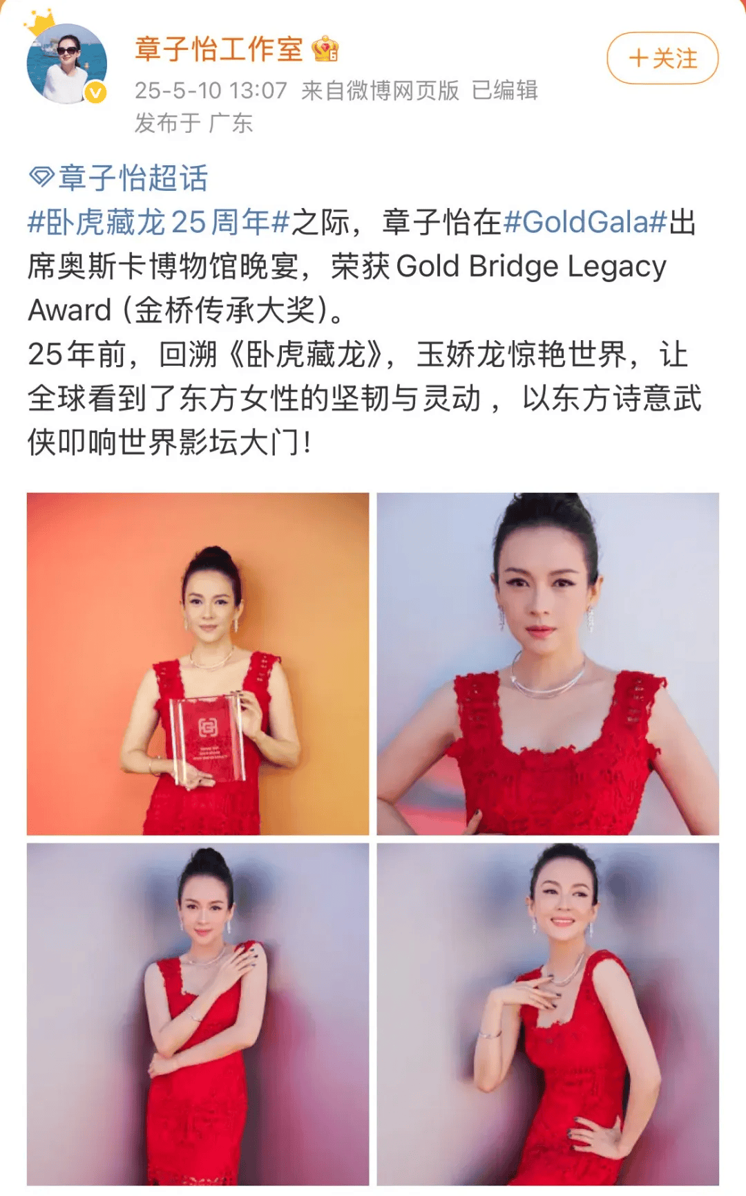 《卧虎藏龙》25周年之际,章子怡在GoldGala出席奥斯卡博物馆晚宴 ,荣获Gold Bridge Legacy Award(金桥传承大奖)。25年前,回溯《卧虎藏龙》,玉娇龙惊艳世界,让全球看到了东方女性的坚韧与灵动,以东方诗意武侠叩响世界影坛大门。