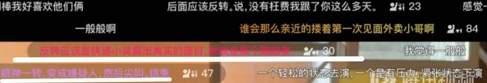 其实,他俩已经给角色的合理性丰富了细节。吴施乐隔着门几次叫外卖员把外卖放门口,刘家祎则设计了外卖员是听障患者,只能磕巴着简单说几个字,又把饭弄撒,才一直敲门。吴施乐开门前手里紧握一个水杯,如果来人有问题,猛地砸对方脸上也有一刻自救机会。