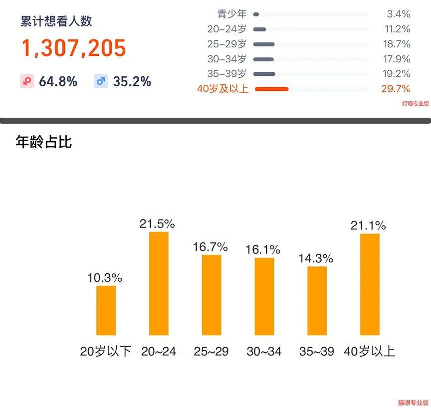 即便在大家引以为傲的《哪吒2》的观影人群画像中,依据灯塔数据库和猫眼专业版的分析,30-39岁的观众占比均超过了30%,20-24岁的观众占比仅为11.2%(灯塔专业版)和21.5%(猫眼专业版)。