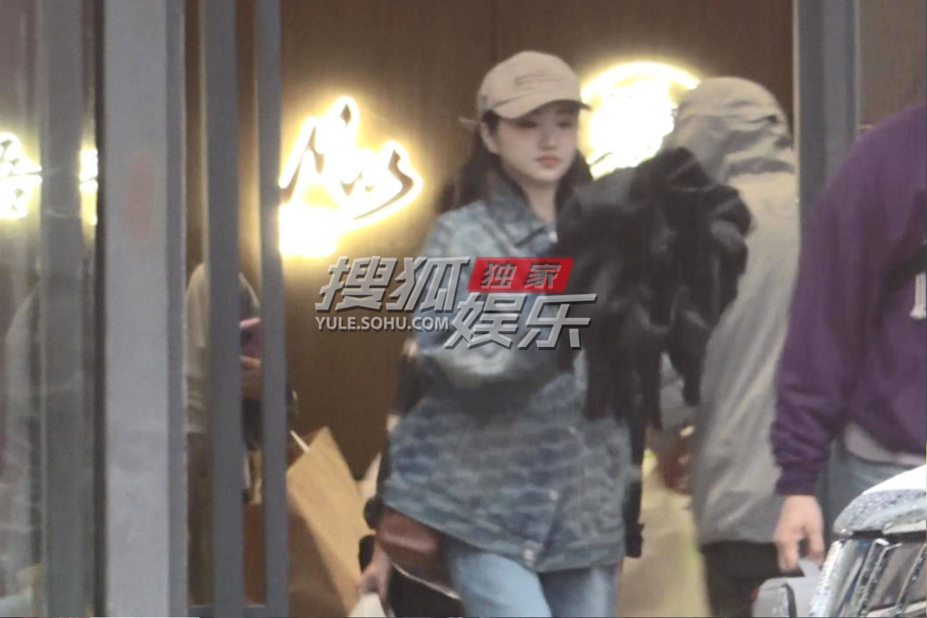 景甜身穿宽松牛仔套装,斜挎小巧精致的包包,脚踩舒适平底鞋。