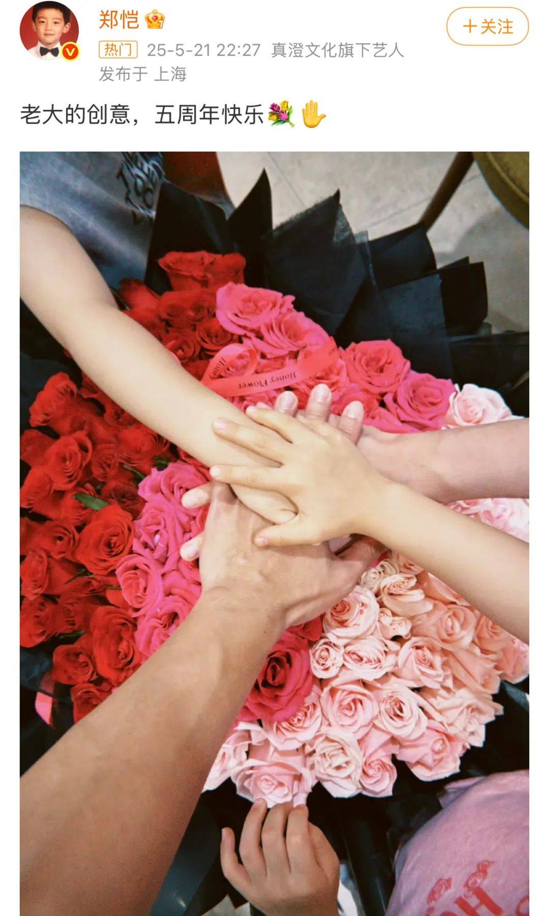 5月21日,知名男演员郑恺在个人社交平台发文:老大的创意,五周年快乐。