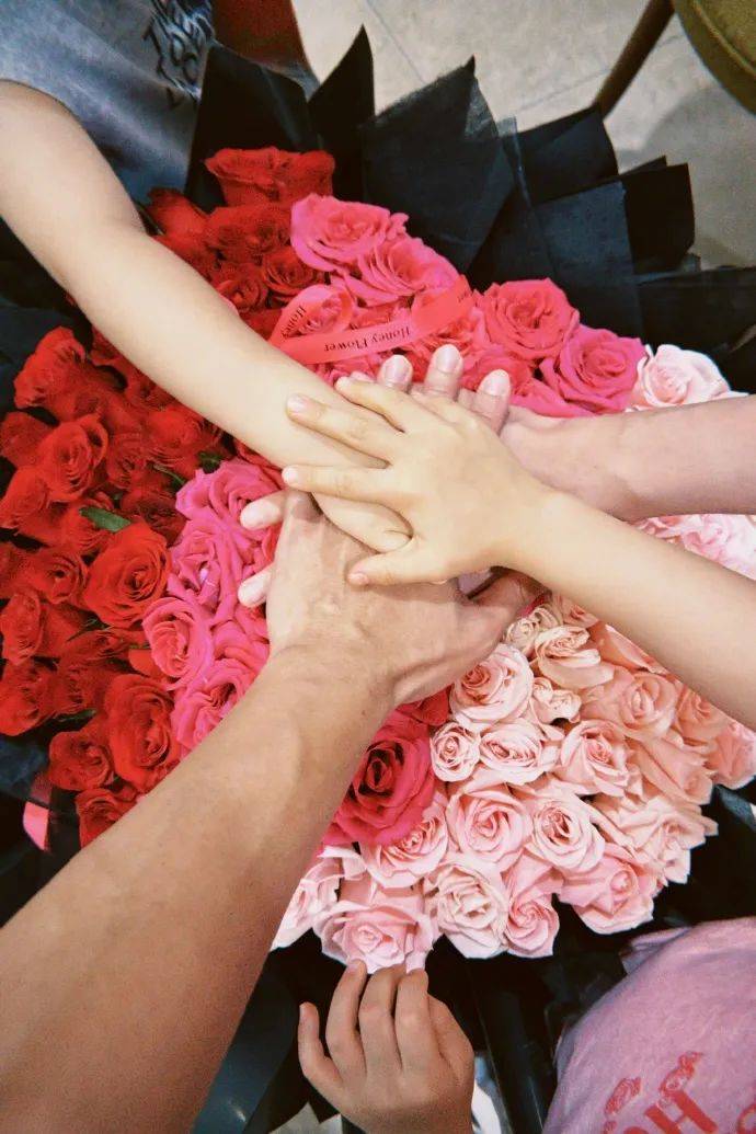 同时晒出了全家叠手合照和一束超大玫瑰。
