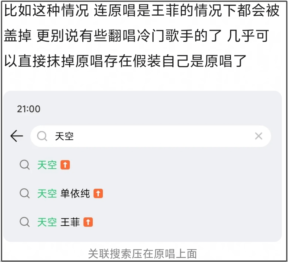 ——《天空》搜索结果排序,也是单依纯压在王菲之上,不排除有人不了解来龙去脉,一看搜索结果,直接就把单依纯当作《天空》的原唱。