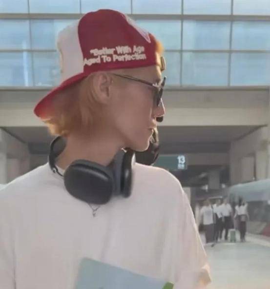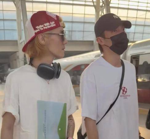 只见鹿晗染着黄头发,戴着红色帽子和墨镜,穿着白色体恤,虽然是一如既往的时尚。