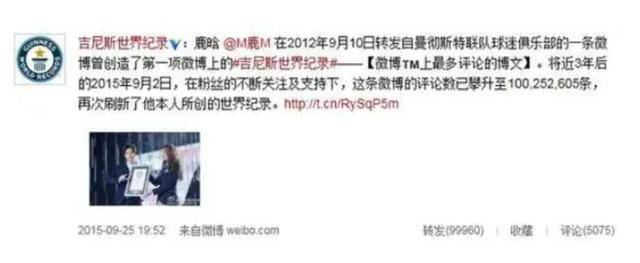 在鹿晗人气巅峰时期,喜爱足球的他,无聊时候随手转发了一条曼联动态,便因为他的超高人气,便一举收获了1300条的评论,直接创下了吉尼斯世界记录。