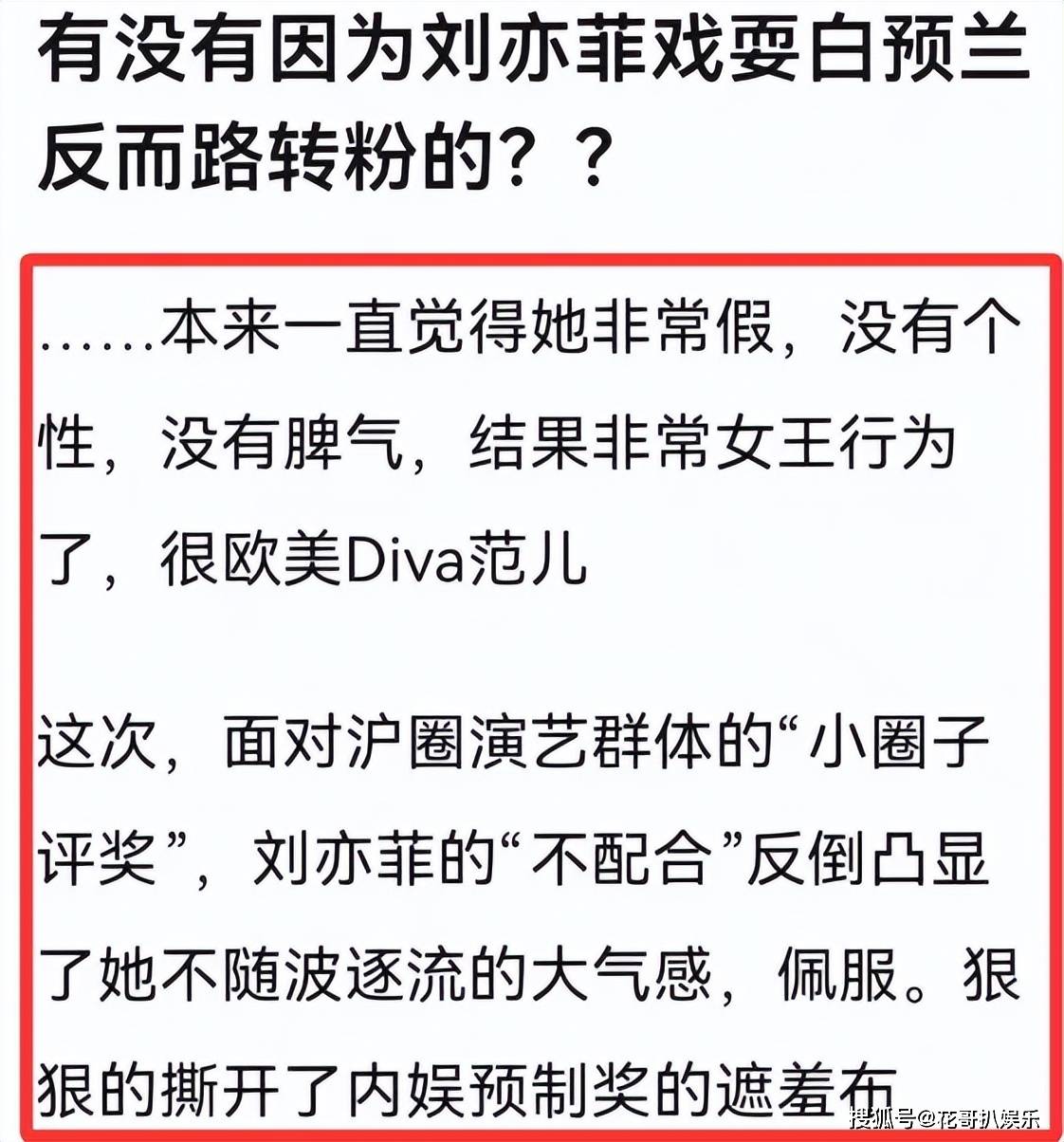 问题是,刘亦菲如果真是这种人淡如菊的性格也就罢了,就像一些富二代,来内娱就是玩票的,得不得奖无所谓,开心了拍两部剧,不开心回家继承遗产。但很明显刘亦菲不是啊,她在内娱混不下去纯属能力不行,人缘也不行,本来当个特型演员,当个天仙姐姐就够了,偏偏自命不凡,折腾十几年折腾一堆笑话,现在又故作清高和圈内人处不来,然后卖惨说自己被整个娱乐圈孤立了,觉得是现在圈内的艺人集体排外、霸凌她,可把她委屈坏了。