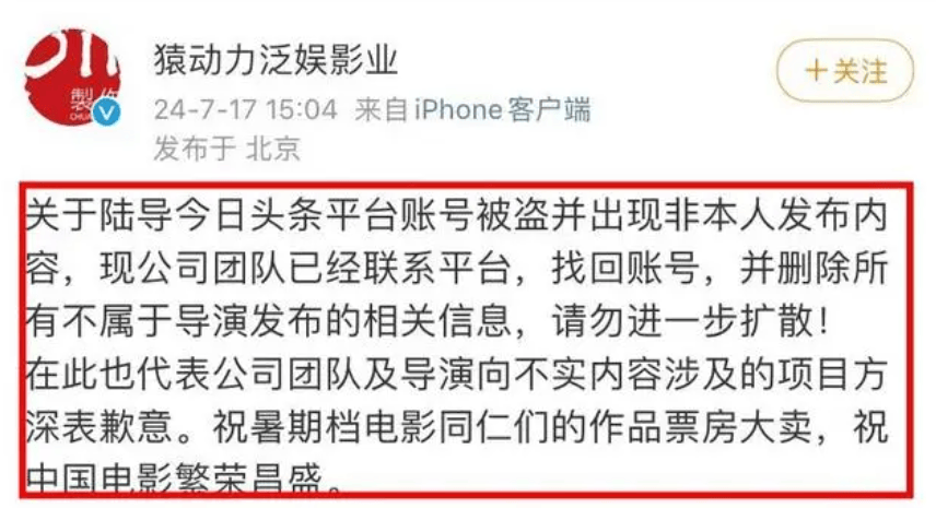 于是,7月17日,陆川通过公司账号发文,表示账号被盗,已经删除差评,并且祝暑期档电影票房大卖。