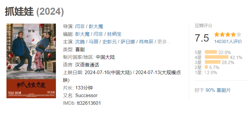 《抓娃娃》的预测票房则已经高达37.58亿,豆瓣上13万人也给出了7.5分的高口碑,这对于喜剧片来说绝对不低,可以说好于90%的喜剧片。