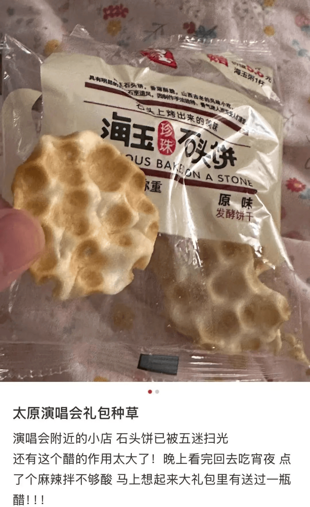 演唱会现场也秒变种草现场,好多山西特产像石头饼、杏糕之类的,附近小店被一扫而光又转战购物平台,回程路上立马下单。