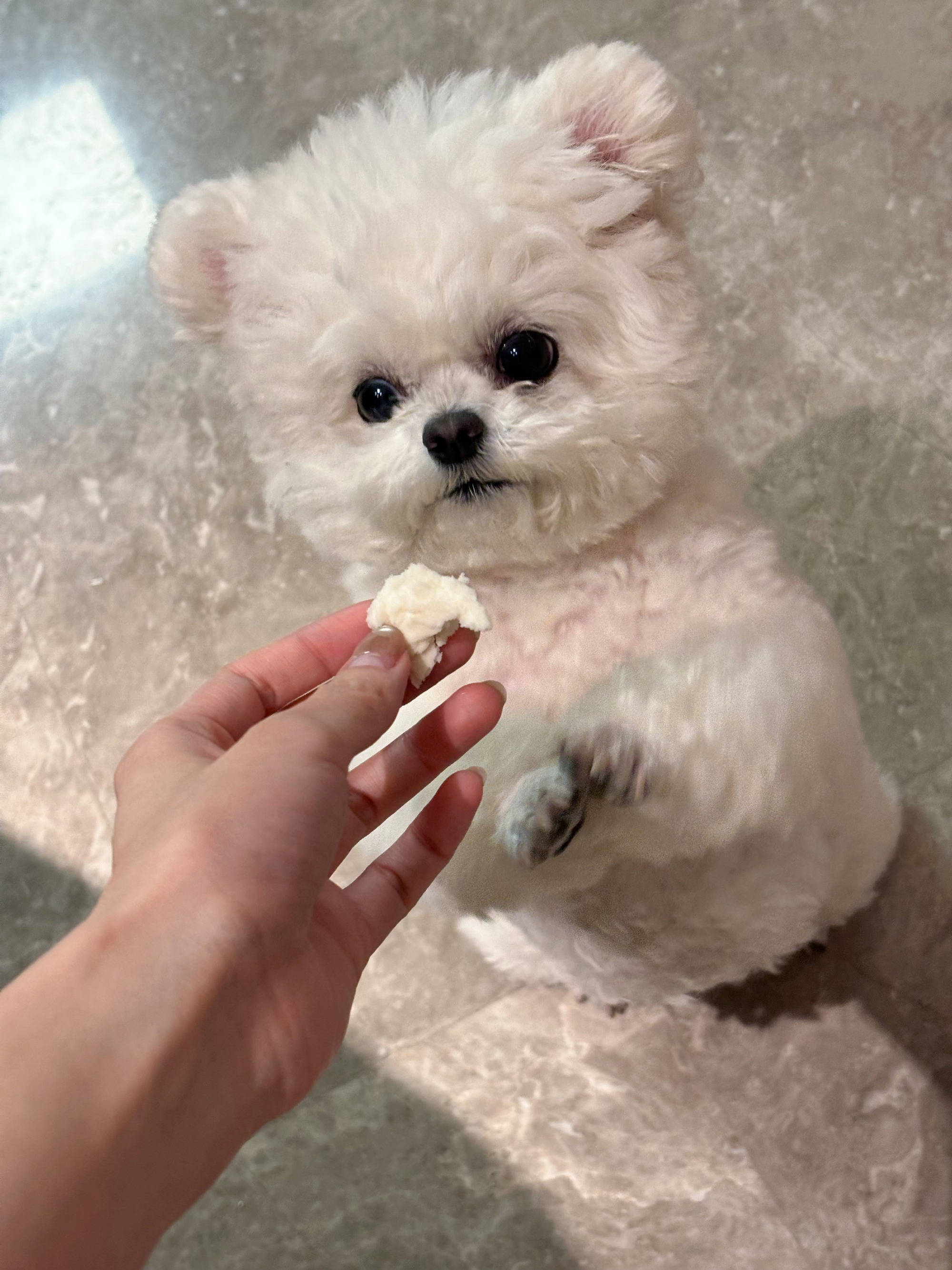 王玉雯给小狗喂食物。