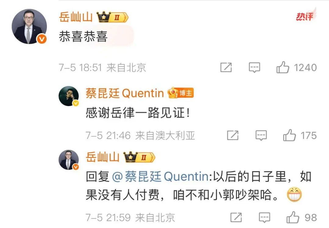 在评论区,律师岳屾山也留言:恭喜恭喜!蔡昆廷则回复:感谢岳律师一路见证!岳律师则打趣:以后的日子里,如果没有人付费,咱不和小郭吵架哈。