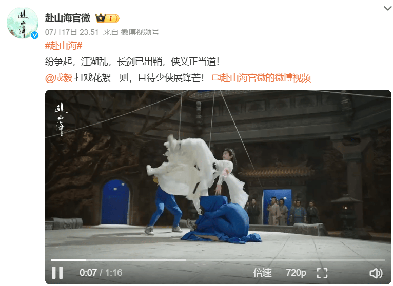 《赴山海》官方发了一则他拍打戏吊威亚的花絮;
