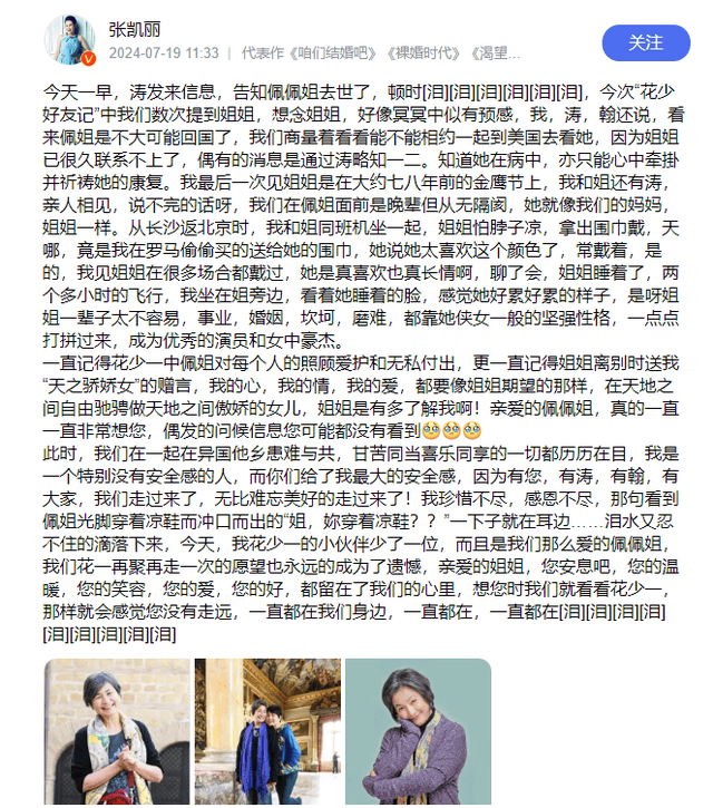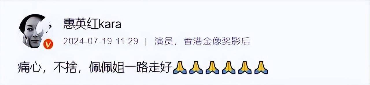 在郑佩佩去世的消息传开后,娱乐圈众多艺人纷纷发文悼念,包括周星驰、刘涛、李若彤、惠英红、张雨绮、金晨、张凯丽等,大家都是那样的不舍她。