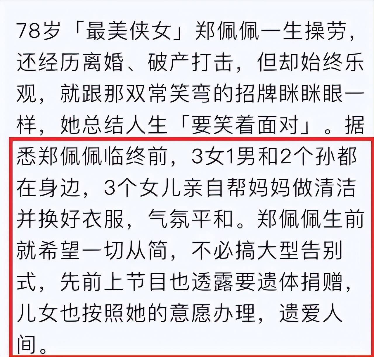 在郑佩佩去世后,其子女接受了采访,透露了母亲去世的细节,郑佩佩临终前,3个女儿1个儿子以及两个孙子都在身边,3个女儿帮妈妈做清洁并换好衣服,气氛平和,郑佩佩生前希望一切从简,不搞大型告别式,先前上节目也透露要捐赠遗体,儿女也会按照她的意愿办理,遗爱人间。