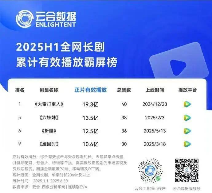 在云合数据2025H1全网剧集累计有效播放霸屏榜TOP10中,腾讯视频独占4席(《大奉打更人》《六姊妹》《折腰》《雁回时》),并以55.9亿正片有效播放量成为TOP10中总播放量最高的平台。
