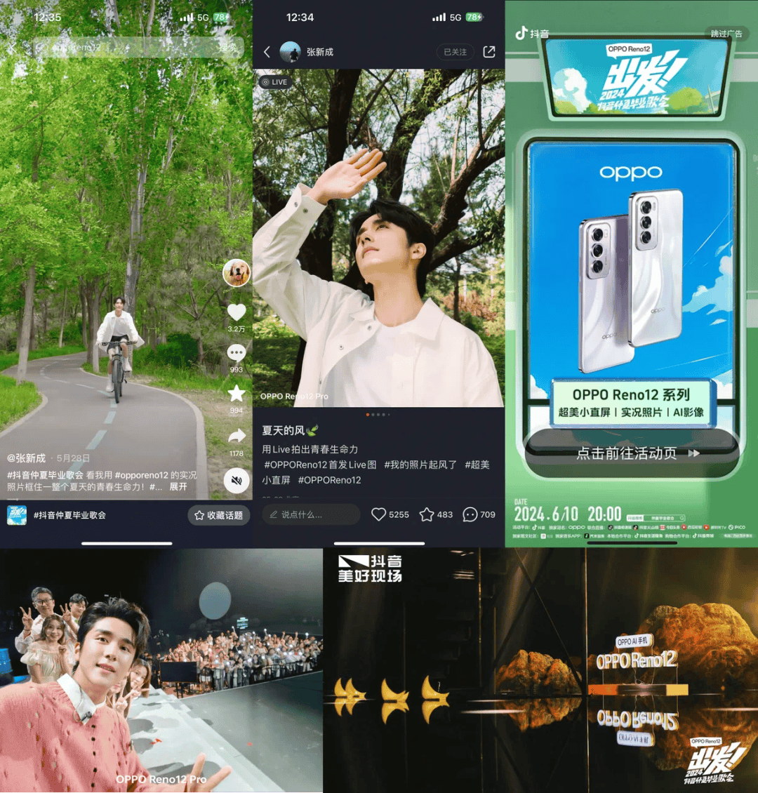 一个很明显的现象是,抖音每年都能成功推动一些节点限定演出IP。比如「抖音仲夏毕业歌会」,每年都能受到大学生群体热烈追捧,今年 #抖音仲夏毕业歌会# 的话题曝光达到了3.9亿+,李宇春紧贴歌会主题唱响经典《下个,路口,见》、周深空灵声线再唱暖心《小美满》等舞台都获得了不错讨论度,而OPPO Reno12、茶百道、上海大洋千树等品牌亦通过冠名活动、联名营销等方式赋能其商业化运作。