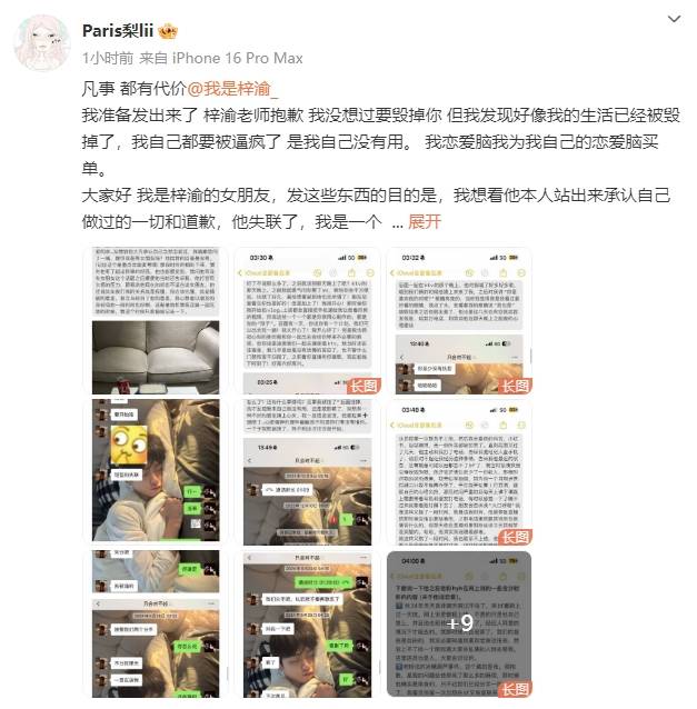 搜狐娱乐讯 23日,自称是梓渝女朋友的女网友“Paris梨lii”发长文要求梓渝本人出面承认隐瞒恋爱、情感操控及失联行为并道歉,还晒出了聊天记录、合照和同框视频。