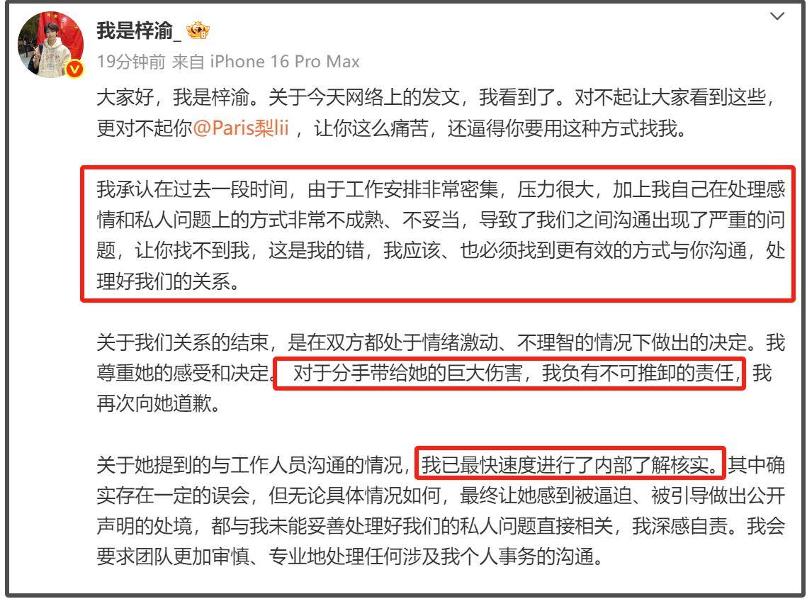 随后,梓渝本人火速发声回应,表示自己在处理感情和私人问题上的方式非常不成熟、不妥当,导致了他们之间沟通出现了严重的问题,并承认分手是在双方都处于情绪激动、不理智的情况下做出的决定。对于分手带给女方的巨大伤害,他负有不可推卸的责任,因此再次向她道歉。
