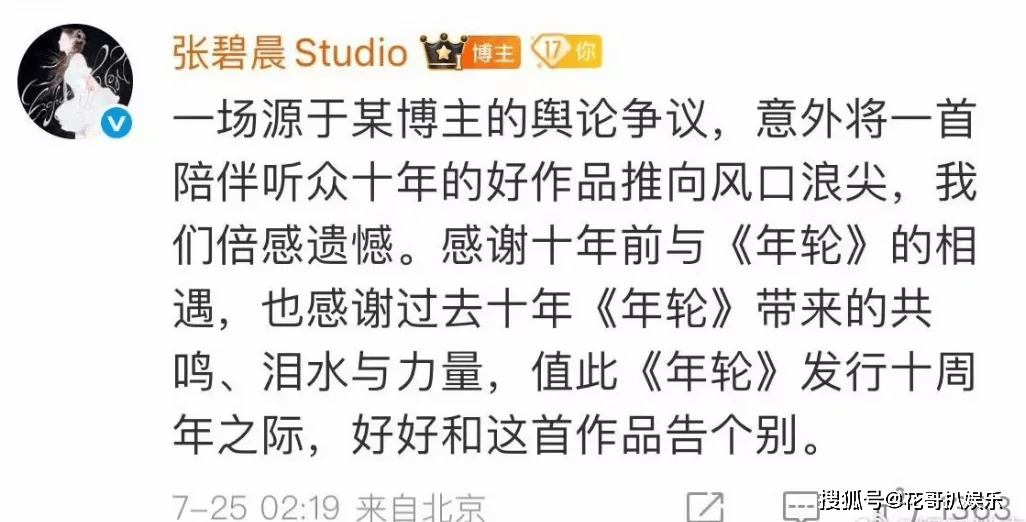 汪苏泷都发声了,张碧晨再沉默下去就有点不礼貌了,两个小时之后她这边也发了长文。张碧晨这边态度也挺强硬的,坚称唯一原唱的说法,而收回版权的汪苏泷仅仅是词曲作者,而且有官方证据来证明。可惜这也没啥意义了,她版权还是争不过汪苏泷,最终只能在《年轮》发布十周年之际遗憾告别这首歌。