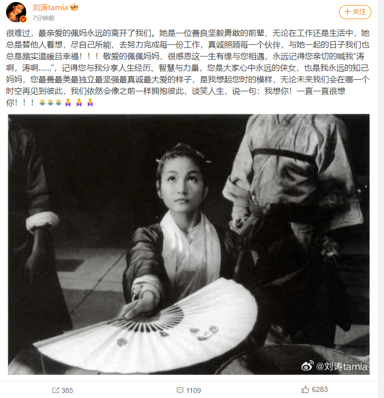 “很难过,最亲爱的佩妈永远的离开了我们。”随后,演员刘涛通过微博发文表示“武侠影后”郑佩佩去世。刘涛在文中称:“她是一位善良坚毅勇敢的前辈,无论在工作还是生活中,她总是替他人着想,尽自己所能,去努力完成每一份工作,真诚照顾每一个伙伴,与她一起的日子我们也总是踏实温暖且幸福。”