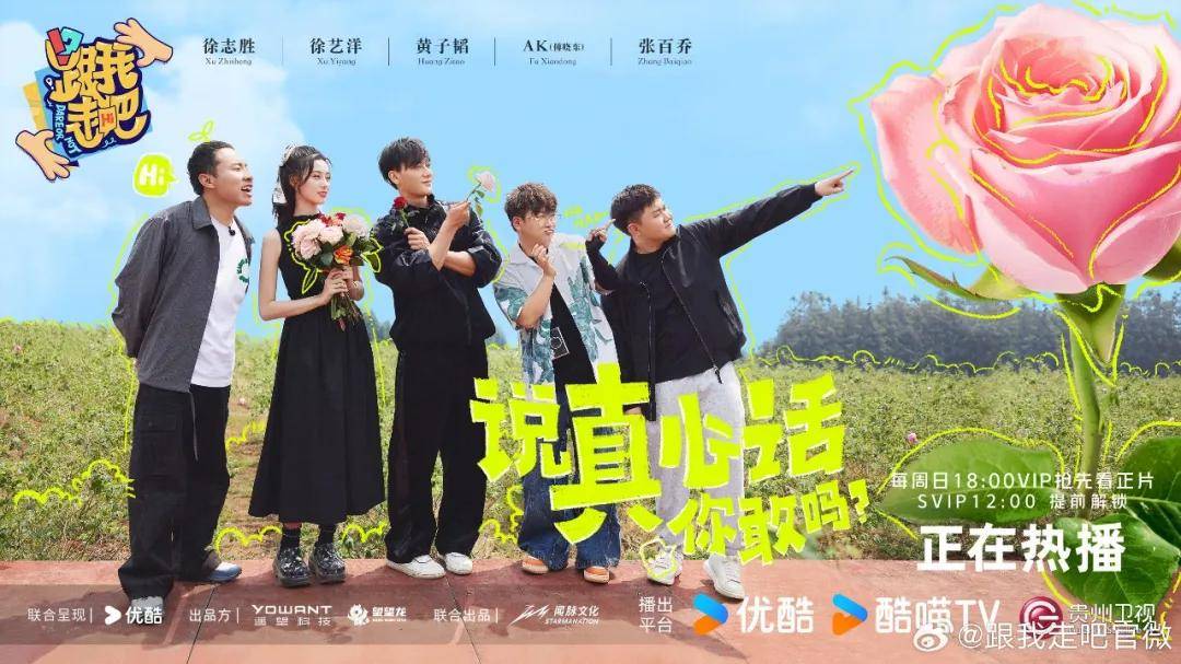 抛开恋情的话题,《跟我走吧》的节目模式很简单,在云南文旅和宣传部的邀请下,黄子韬和徐艺洋邀请好友们一起,踏上一场为期15天的云南自由采风之旅,体验、甚至挑战各种当地极限文化活动,在这个过程中学会跳出舒适圈,并把云南的风土人情、自然美景和文化遗产介绍给观众。