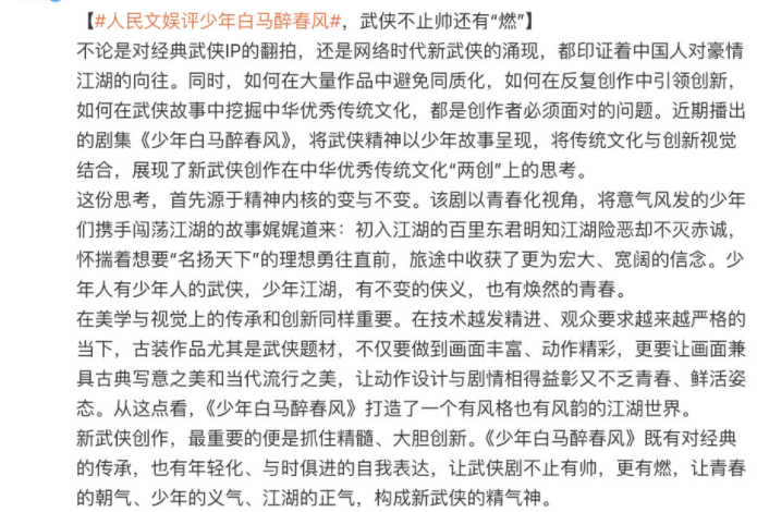 搜狐娱乐讯 7月22日,人民文娱评价《少年白马醉春风》在传统和创新上的突破更加年轻化,还对少白的视觉效果和武术打戏表示了认可,称少白的画面兼具古典写意之美和当代流行之美,让动作设计与剧情相得益彰又不乏青春、鲜活姿态。